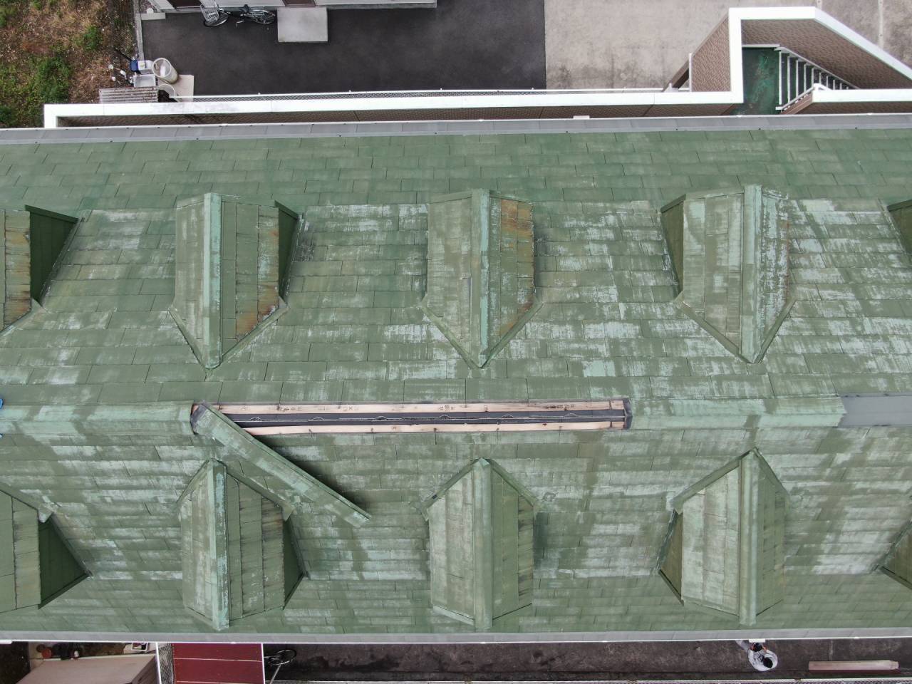 甲府市のドーマー屋根のアパートの棟板金が突風で飛散したので補修しました 2025/04/11 飛散した棟板金を交換しました 棟板金(むねばんきん)はヌキ板を先に屋根に設置し、釘を噛ませた上で設置します。 お写真に見える木の板が、ヌキ板と呼ばれる下地木材です。 飛散した棟板金も状態が良ければ再利用できます 今回は高いところから地面に叩き落とされたので、棟板金の形状が変わってしまいましたが、基本的には再利用することもできます。 風で歪むように落下してしまうため、歪んでしまうことも多いです。 ドーマーの中心の棟の部分も屋根下地が見えてしまっています 棟板金の飛散は、台風や台風並みの突風で起こることもあります。 その場合は、ご加入中の火災保険の対象ですので、是非弊社にご相談ください! ヌキ板も棟板金も新しいものを確実に設置します 棟板金はSUSビスという、特殊な形状のネジでしっかり固定します。 また内側にコーキング(シーリング)を打ち、防水性を持たせて施工します。 こちらが棟板金の影の功労者のヌキ板です ブログの最初にもお伝えしましたが、棟板金を直に設置せずに木材を間に噛ますことにより、圧倒的に屋根への固定力が増します。 木材のヌキ板でも十分に長持ちしますが、腐食がご心配な方は樹脂製のヌキ板もありますので、弊社にご相談くださいね( `ー´)ノ タフモックが代表的な製品ですが、豊富な施工実績を持っております。 雨漏れ 火災保険 板金交換