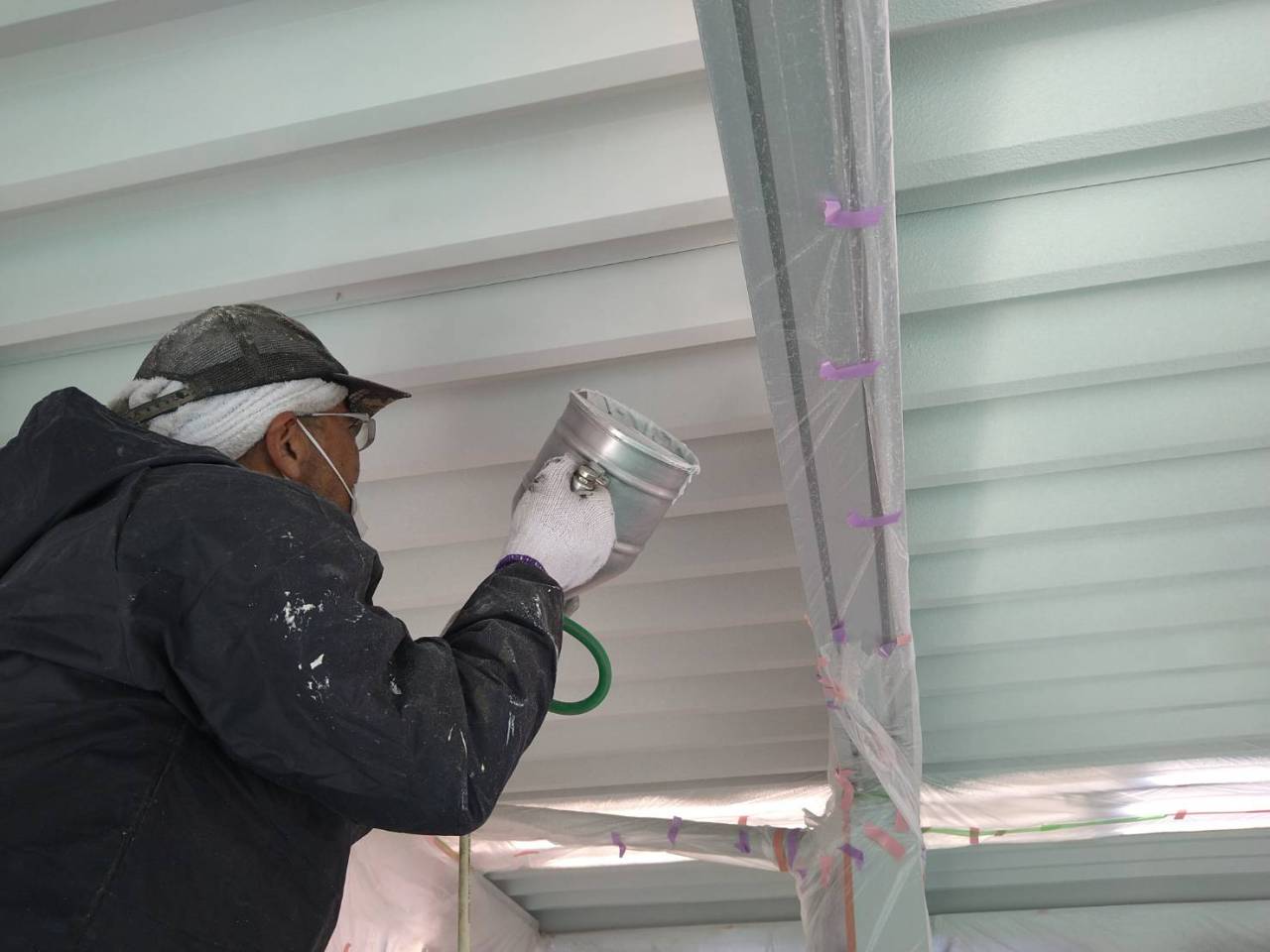 大月市で結露の酷い折半屋根カーポートをケツロナイン吹付けで解消しました 2025/04/18 結露でお悩みのカーポートの裏の部分に、まずは下地作りを行います。 ナイロンスポンジで全体をケレンし、ミッチャクロンを塗ってから錆止め剤であるハイポンファインデグロをローラーで塗ります。ここまでが下地調整・下塗りの段階です。 結露の発生を抑え、カーポートや車庫からの水滴を吸収を抑える効果があります。 コンクリート・鉄など幅広い下地に対応している画期的な塗料です。 素敵なカーポートに、素敵なお車が並んでいます。 でも実は結露に悩まされていた、、。そんなお客様にこそ結露防止塗装を知っていただきたいです。 ケツロナインは吹付けで塗装すると、表面にざらざらと粒状に塗料をのせることができます。 軒裏、屋根裏であり吹付け塗装するには難しい箇所ではありますが、丁寧に塗膜が厚くなるように仕上げました。 冬や梅雨時期の結露にお悩みのお客様に、是非知っていただきたい塗料です。洗車の綺麗さが長続きすることができますよ!(^^)!