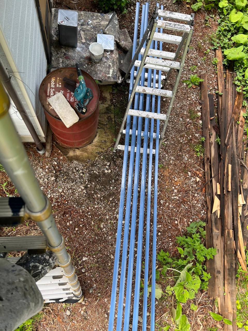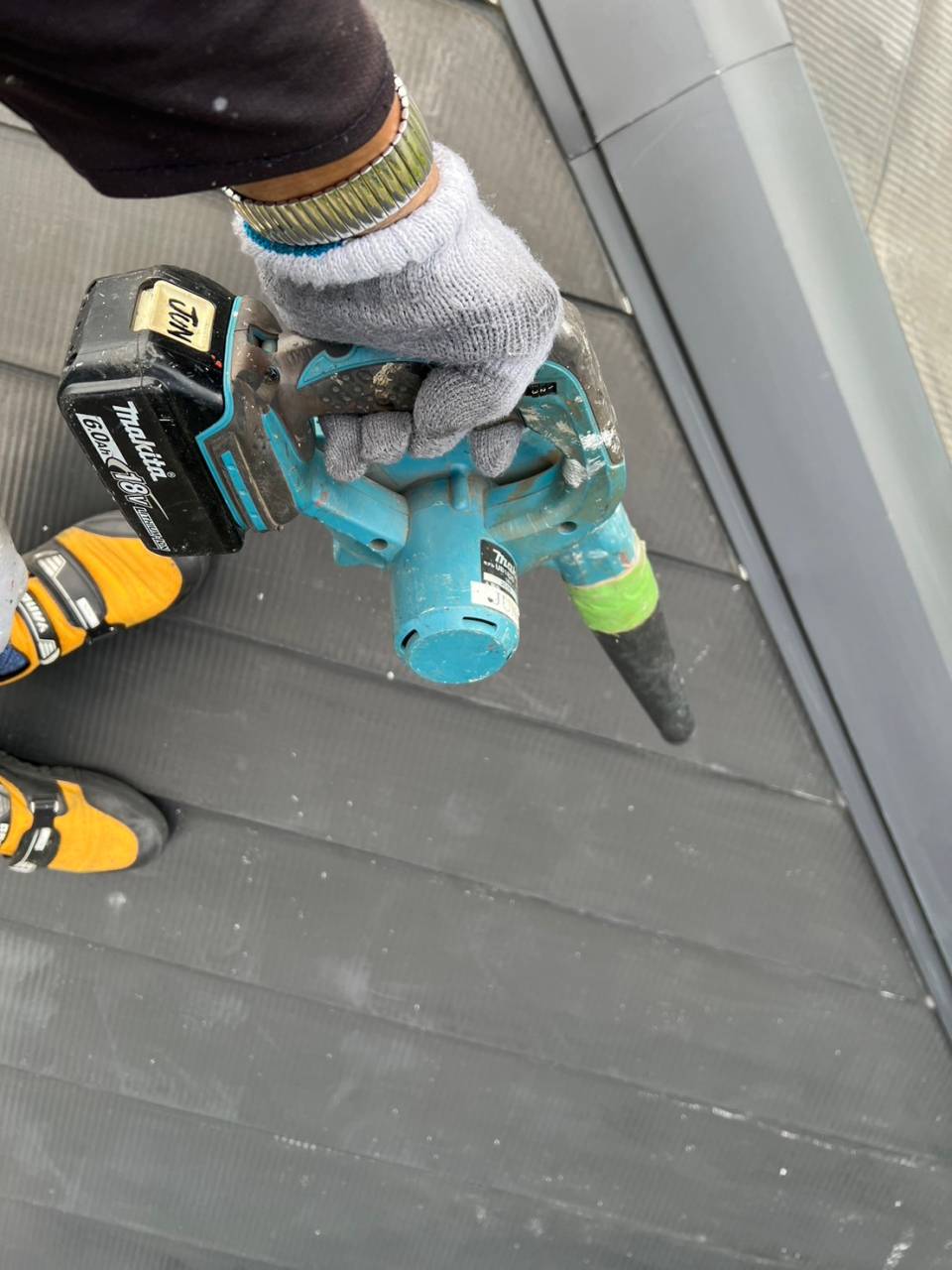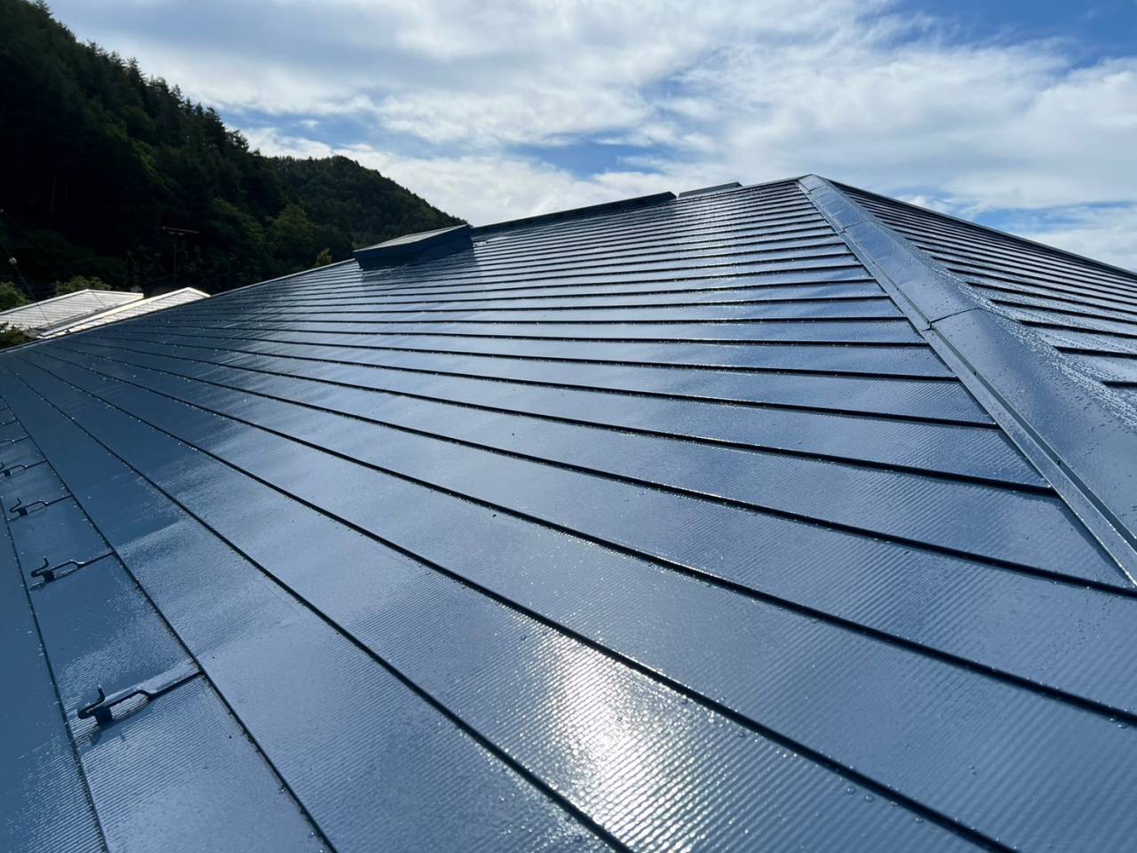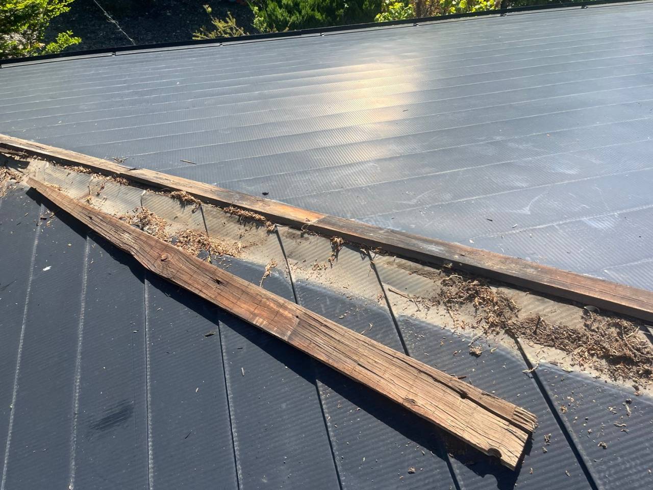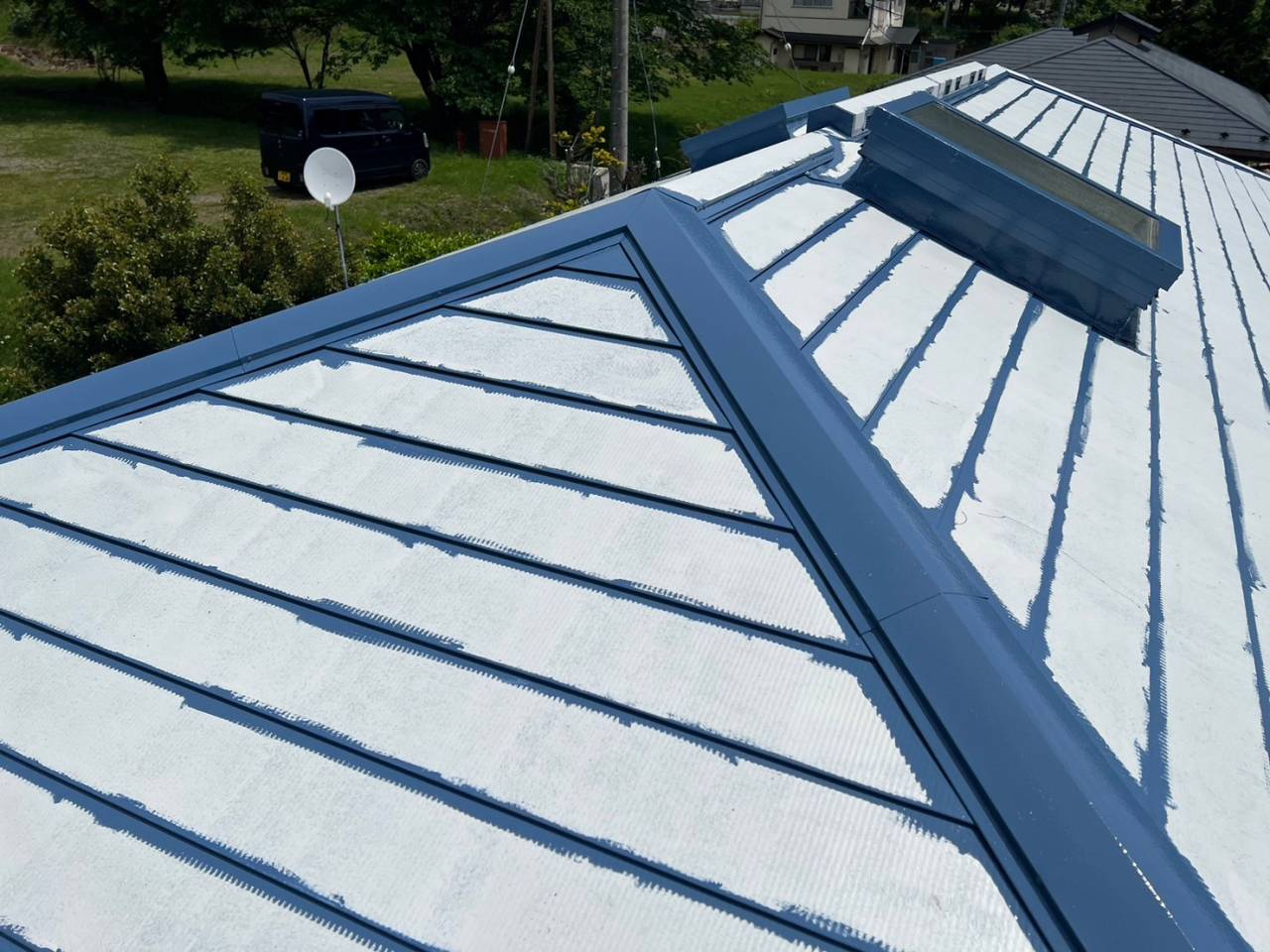 富士河口湖町で棟板金の交換を伴うガルバリウム鋼板屋根の塗装工事を実施しました 2025/05/03 高圧洗浄後にケレン作業を実施 ガルバリウム鋼板屋根は、塗装前にしっかりとしたケレン作業が必要です。 ナイロンタワシで丁寧に、汚れを除去し微細な傷を付けます。 ブロアーで汚れを飛ばします ブロアーを使用し、ケレンで出た汚れを吹き飛ばします。 このまま塗装してしまうと塗膜の中に汚れが混入したり、塗膜の密着不良に繋がります。 棟板金の下地木材を交換します 棟板金(むねばんきん)の下地木材は、完全に腐ってしまっていました。 棟板金を固定する釘やビスが効かなくなってしまうので、新しい木材に交換します。 ヌキ板と呼びます。 下塗りを行ないます 下塗りは先程の棟板金や、天窓廻りなどを先に塗り込んでいきます。 ダメ込み塗装と呼ばれ、ダメな部分が出ないように丁寧に塗装たっぷりと塗料を塗布します。 中塗りを実施します 中塗りも丁寧に実施します。ガルバリウム鋼板の継ぎ目・棟板金など下塗りと同じく丁寧にダメ込みしながら少しずつ面積を広げ塗装していきます。 上塗り(3回塗り)で屋根塗装工事完了です 弊社では、屋根塗装も外壁塗装もきちんと3回塗り以上で仕上げます。 塗料の性能を最大限生かして、耐用年数通りの塗膜に仕上がります。 雪止めも外して塗装し、設置し直しました 南都留郡・北杜市などの地域では、雪止めも毎年雪で負担が掛かっています。 脱着してケレンし、屋根同様3回塗りで仕上げています。 弊社は外壁塗装のみならず、屋根塗装も得意としております! 板金交換 屋根塗装